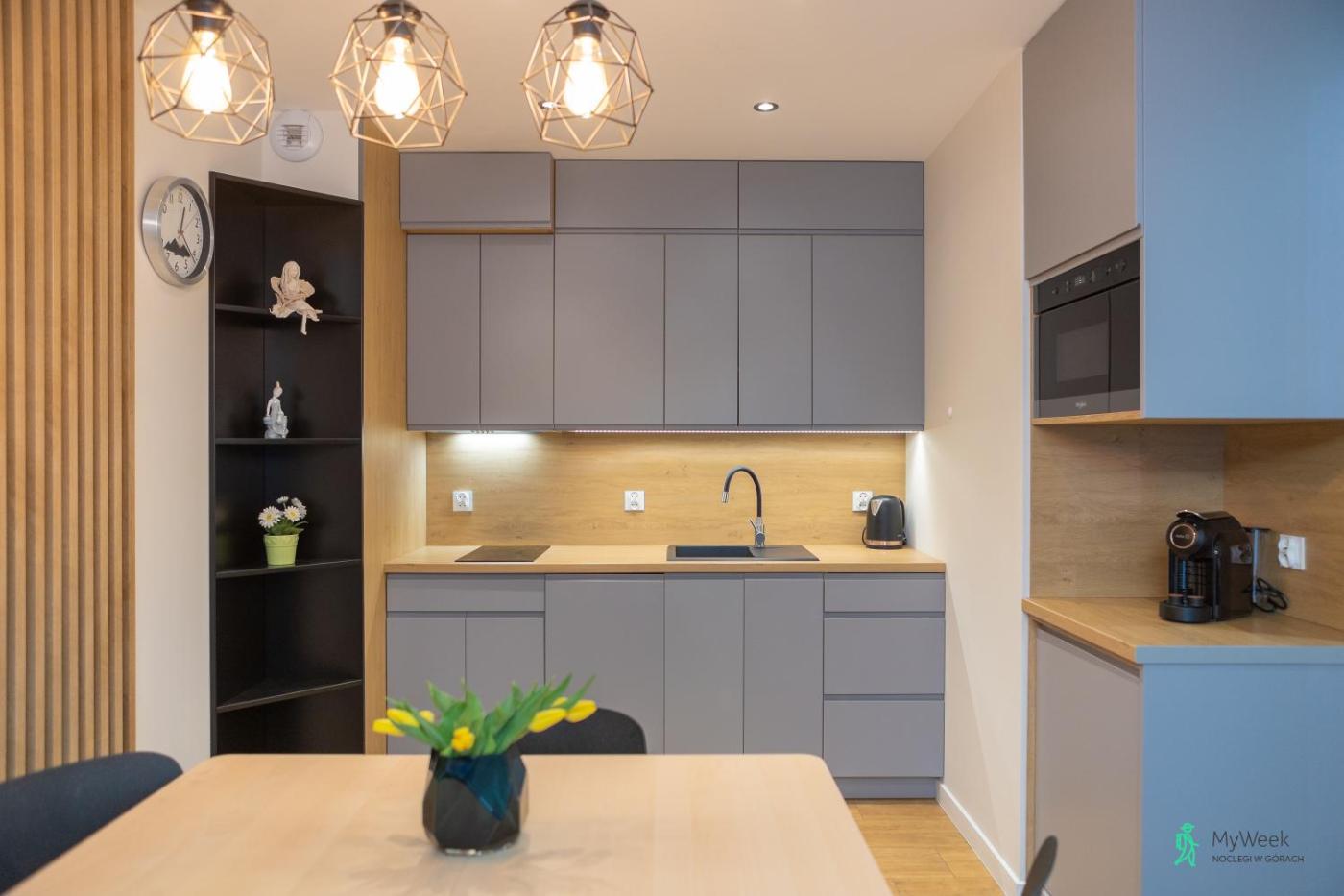 Oferta apartamentu obejmuje sypialnię (1), salon, aneks kuchenny z pełnym wyposażeniem, w tym lodówką i ekspresem do kawy, a także łazienkę (1) z prysznicem oraz suszarką do włosów. W apartamencie zapewniono ręczniki i pościel.