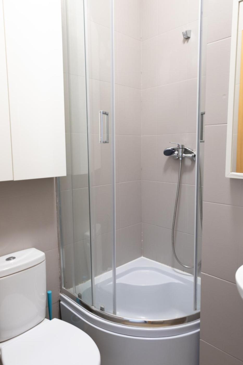 Studio. The studio features a washing machine, a dining area, as well as a private bathroom boasting a shower. In the kitchenette, guests will find a stovetop, a refrigerator, kitchenware and an electric kettle. The studio provides a wardrobe, parquet floors, heating, as well as a flat-screen TV. Studio - 2 osobowy. Powierzchnia pokoju ok.: 18 mkw.